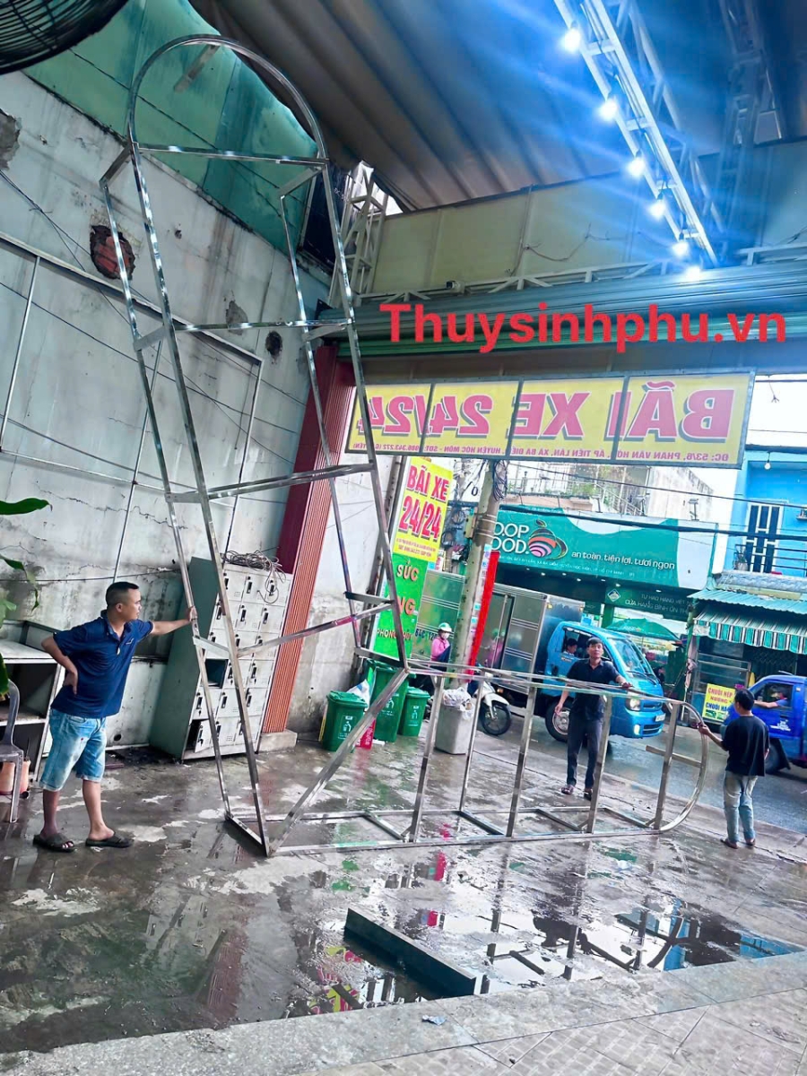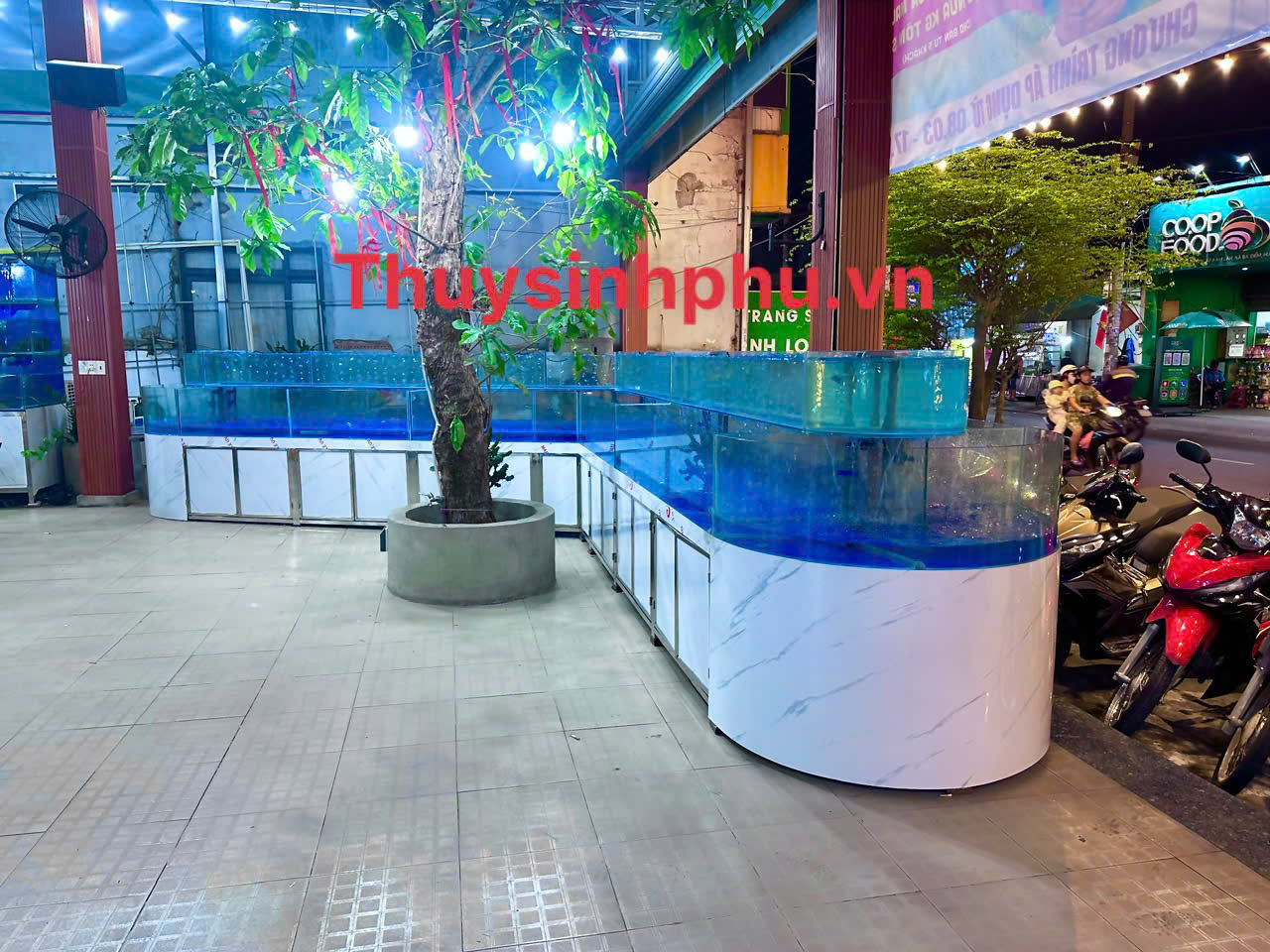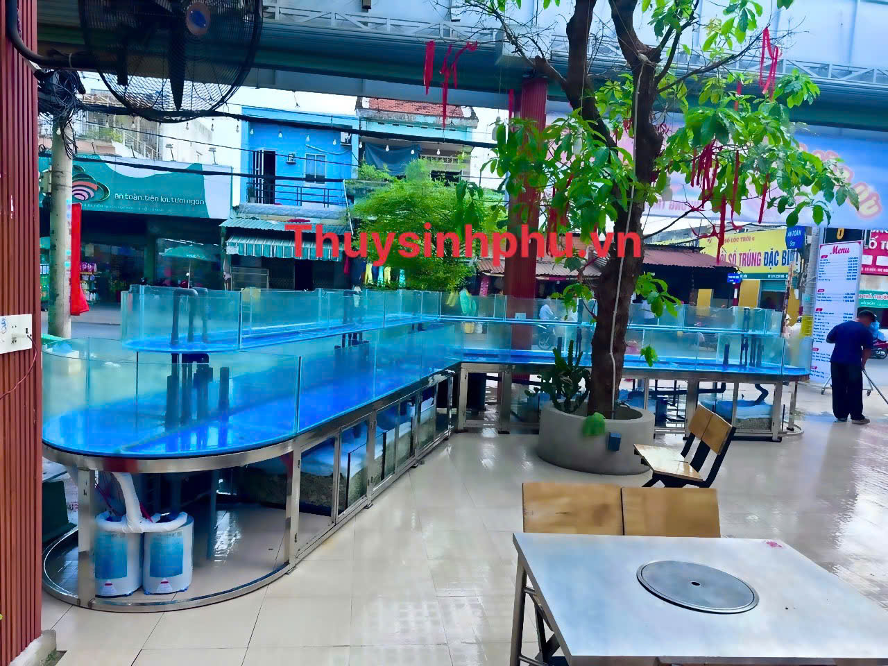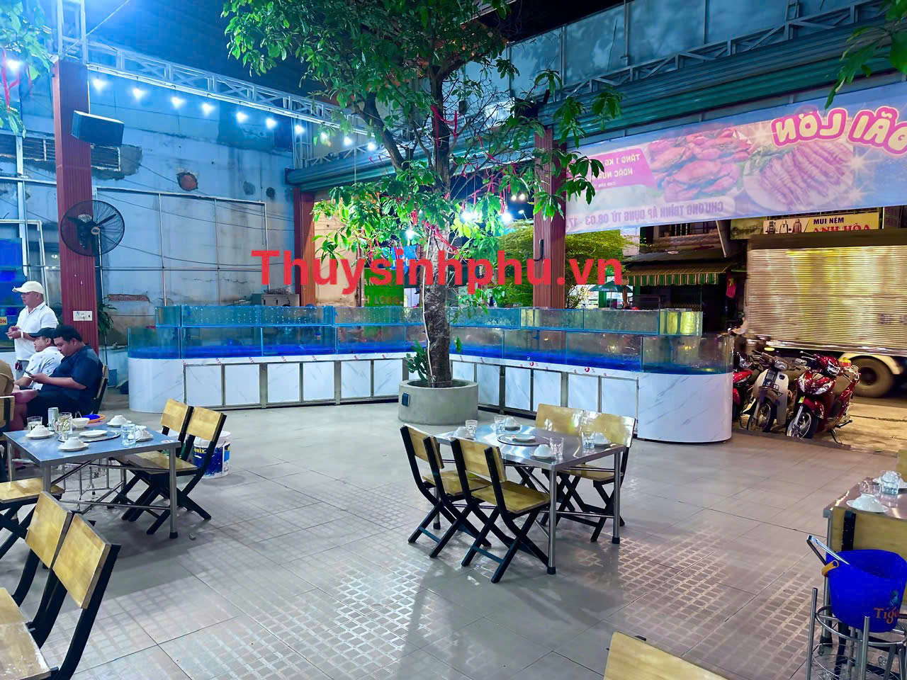 Hồ chứa hải sản dài 10m kính uốn cong của hồ cá thủy sinh phú thi công và bàn giao cho nhà hàng rừng tràm 1 đường dương thị giang quận 12